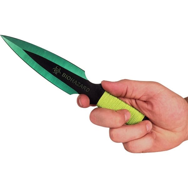 2 Piece Throwing Knife BioHazard. 9″ Length, 2 Piece Set, made from 440 stainless steel, great beginner to intermediate throwing knife. Includes sheath pouch for knives.